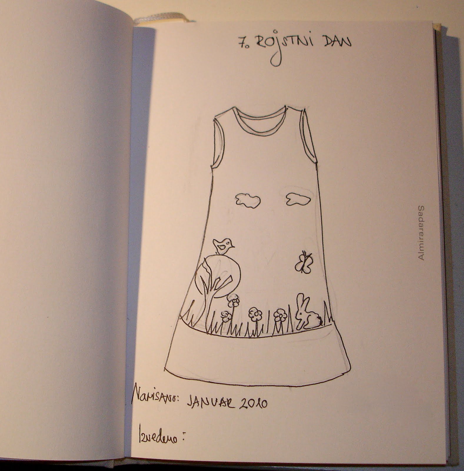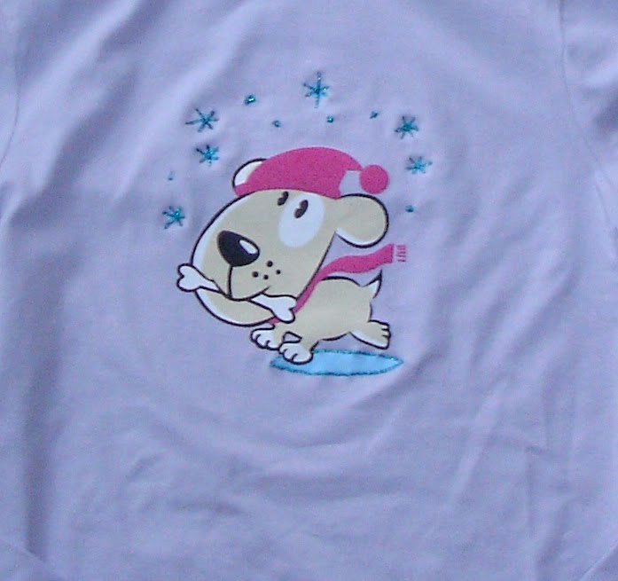 Potrebuješ neko slikico ali fotografijo. V mojem primeru rabiš J., ki mi je kužka celo narisala in mi ga v pdf formatu poslal na moj ekranček ( HVALA J.!). Od tu, pa je romal na ključku do Mumina, kjer so naredili kombinacijo printa (kuža, luža in snežinke) in tiska kosmatene folije (kapica in šal).
