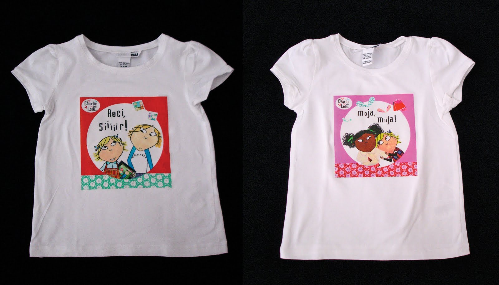 Ja proces sitotiska je dolgotrajen, zamuden, vendar zabaven. Potrebuješ: sito, temnico, fotoemulzijo, ne vem več koliko močne žarnice in potem še prostor kjer tiskaš, pa barvila in seveda dobro idejo (ta je ključna). Torej, na faxu smo vse to imeli, doma pa tega ni. Ko sem hotela naredit kak T-shirt za darilo ali kaj podobnega, sem se posluževala transfernih folij. Vendar so le te uporabne samo na belih majicah. Tako sem nazadnje izdelal tudi tele Charlie in Lola majčke.