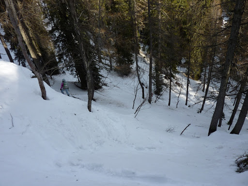 Zaradi slabe napovedi je bilo bore malo ljudi in tako smo tik pod vrhom srečale nekaj veseljakov, ki so malicali v luknji in kasneje še nekaj smučarjev na vrhu. Tu je kar precej pihalo. Oblekle smo se in odločile, da bomo tudi me malicale v luknji:). Hmmmm, luknjo smo zgrešile in in se odločile, da bomo uživale v smuki do koče in tam malicale. Vendar moje noge niso bile najbolj srečne. Sneg je bil na vrhu spihan in pomrznjen, kasneje pa seveda težak, južen. Vendar nekaj lepih zavojčkov mi je vseeno uspelo in kar precej sem vriskala. Nisem pa vedela, da sledimo nekim sledem in da ne vemo, če so le te prave. Oziroma če se ni ta, pred nami, tudi izgubil.:)