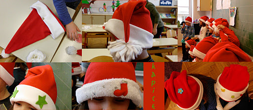 Starši so prispevali za blago, vsak otrok je prinesel nek našitek, gumb, zvonček, volnico, kar so imeli doma. Prišlo je še nekaj starih staršev in tako smo v dveh urah naredili več ali manj vse kapice, ki so si jih učenci nato sami okrasili. Namen je bil, da se otroci naučijo osnovne izdelave cofka (jaz sem se jo spotoma naučila, kar na delavnici od babic), takega volnenega in takega iz flisa in da si sami prišijejo kak gumb ali pa našitek. Kar je večini tudi uspelo. Nastale so krasne kapice in ponosno so odkorakali z njimi na kosilo.