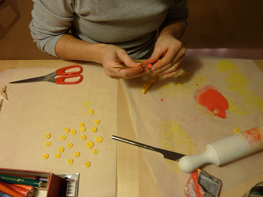 V vrtcu so nas povabili, da otrokom predstavimo poklic ali pa opravimo z njimi kako delavnico. Tako sem izbrala prednovoletni čas, pobasala šivalni stroj, ostanke blaga, lepila, trakce, bleščice in malo dobro volje :). No, če sem čisto odkrita ni blo vse tako spontano, nekaj gumbkov sem sama naredila iz fimomase, nekaj pa sem jih pozlatila (kar z zlatim sprejem) in pobleščila (lepilo v spreju in bleščice).