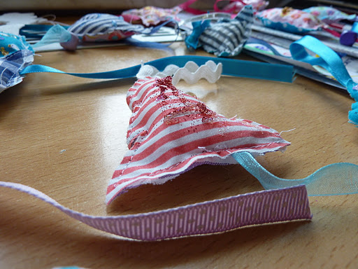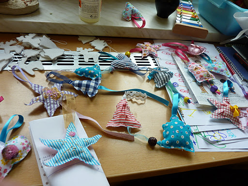 Doma sem pripravila okraske (napol zašite), ki so jih otroci napolnili s polnilom in na licu mesta sem jih dokončno zašila in prišila še kak trakec po želji. Po tem pa so jih krasili z lepili in bleščicami, gumbki , pentljicami …