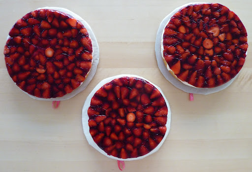 Tri jagodno- jogurtove, ker me je sodelovka z Multipraktika d.o.o. ( no v resnici ga še nisva ustanovili, sam bi ga lahko) prosila, če bi jih spekla za njeno najboljšo prijateljico. Načeloma bi ji ona, sam ker ni vedla, a bo že v porodnišnici, ali samo na poti tja, je mene prosila za uslugo. Naj povem, da mi jo je, kake tri dni preden je šla v porodnišnico, v vročini prinesla ob 10 h zvečer na pokušino. 🙂