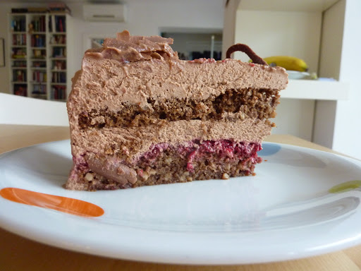 Maline sem zamešala z dvema žlicama sladkorja in jih namazala na biskvit, nato pa nadaljvala z čokoladno smetano.