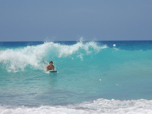 Ko se je bližala polna luna se je vreme malo poslabšalo in na Z strani so se valili prav hudi valovi. Taki pravi surfaški in prav dobro smo se nazabavali z Hello Kitty desko. Manimejkerja je Mitch Buchanon wannabe spodil iz vode, ker so valovi postajali previsoki. Dejal je, da je slab zgled drugim in otrokom. Meni se je zakolcalo po pravi surferski deski (bo res treba diplomo spacat). Ampak tudi tale vožnja po peni je bila lušna. Res čudno, da nismo videli nobenega surfača (takega z desko) ob tako pestri športni ponudbi. Kasneje v lagunah so bili pa Wind surferji in Kiterji v takih valovih, da te k’r v želodcu stisne (žal nimam fotk- crknila baterija).