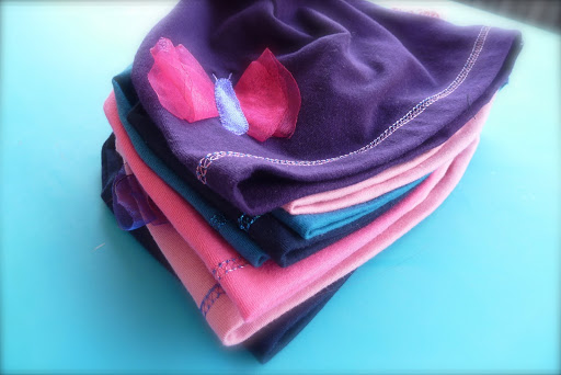 Naredila sem nekaj bombažnih kapic, ki jih moje lumpe še vedno radi nosita, tudi če sta že veliki. Posebej, ko pihlja ali pa, ko imata mokro glavico. Pa tudi, ko morata, kljub visokim temperaturam, pozirat. :)))
