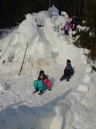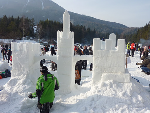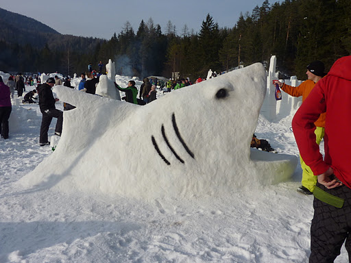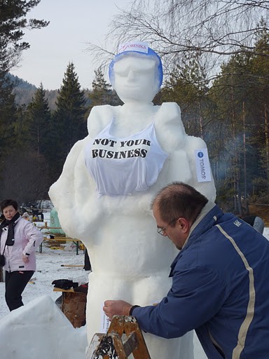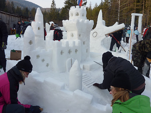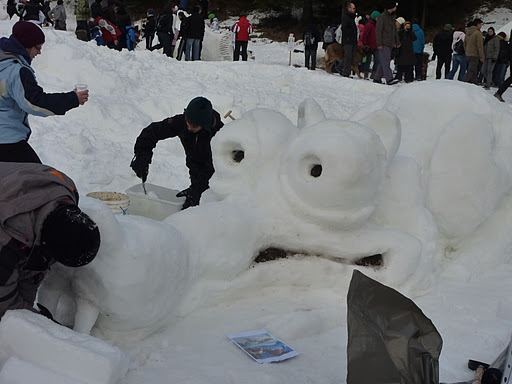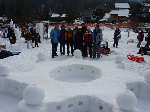 Vendar so se proporci malo spremenili. Zasnovali sta jo dve krajinski arhitektki vendar se je med samo gradnjo malo povečala in ne boste verjeli končana je bila kake pol ure prej kot je bilo potrebno. Kljub enostavnosti na prvi pogled, vse skupaj ni tako enostavno. Sneg je bil namreč umeten in tako čudno suh, da se npr. ni dalo krogelj delati z valjanjem, ampak so zahtevale kiparsko obdelavo. Na srečo smo imeli mladega nadebudnega oblikovalca z zlatimi rokami.:)