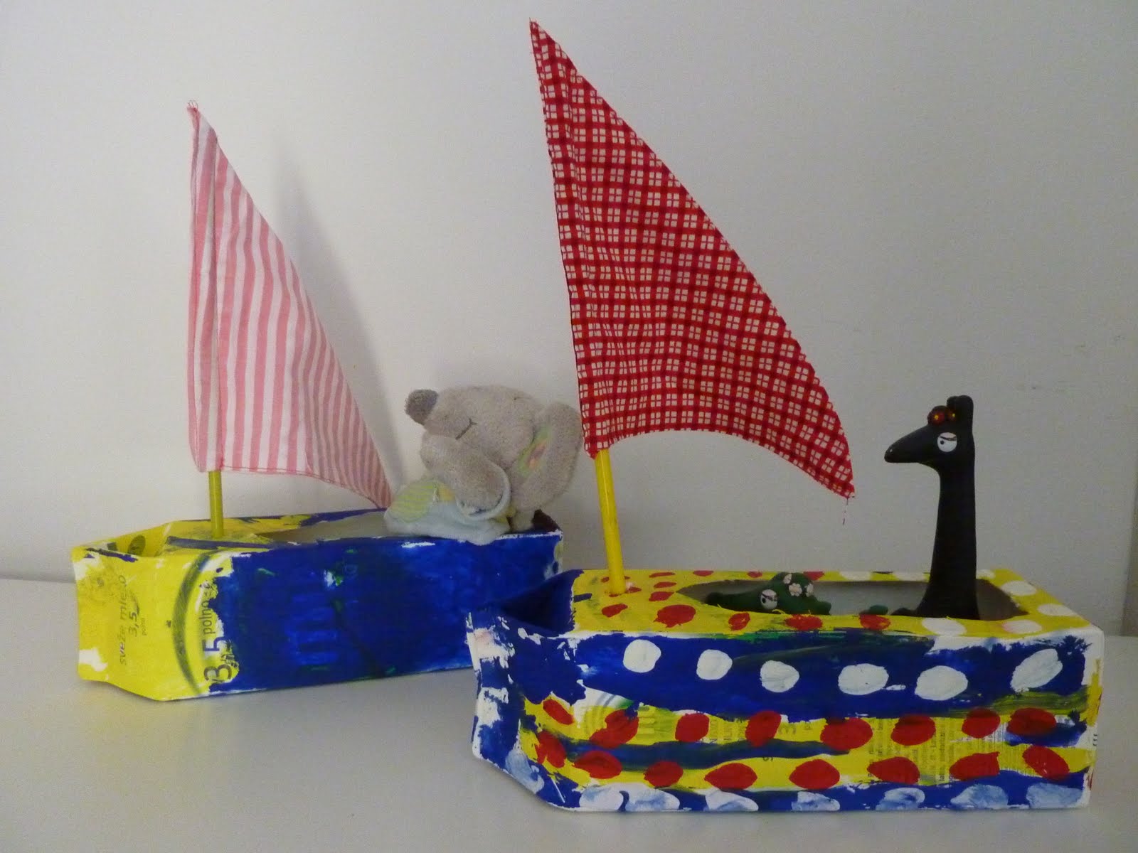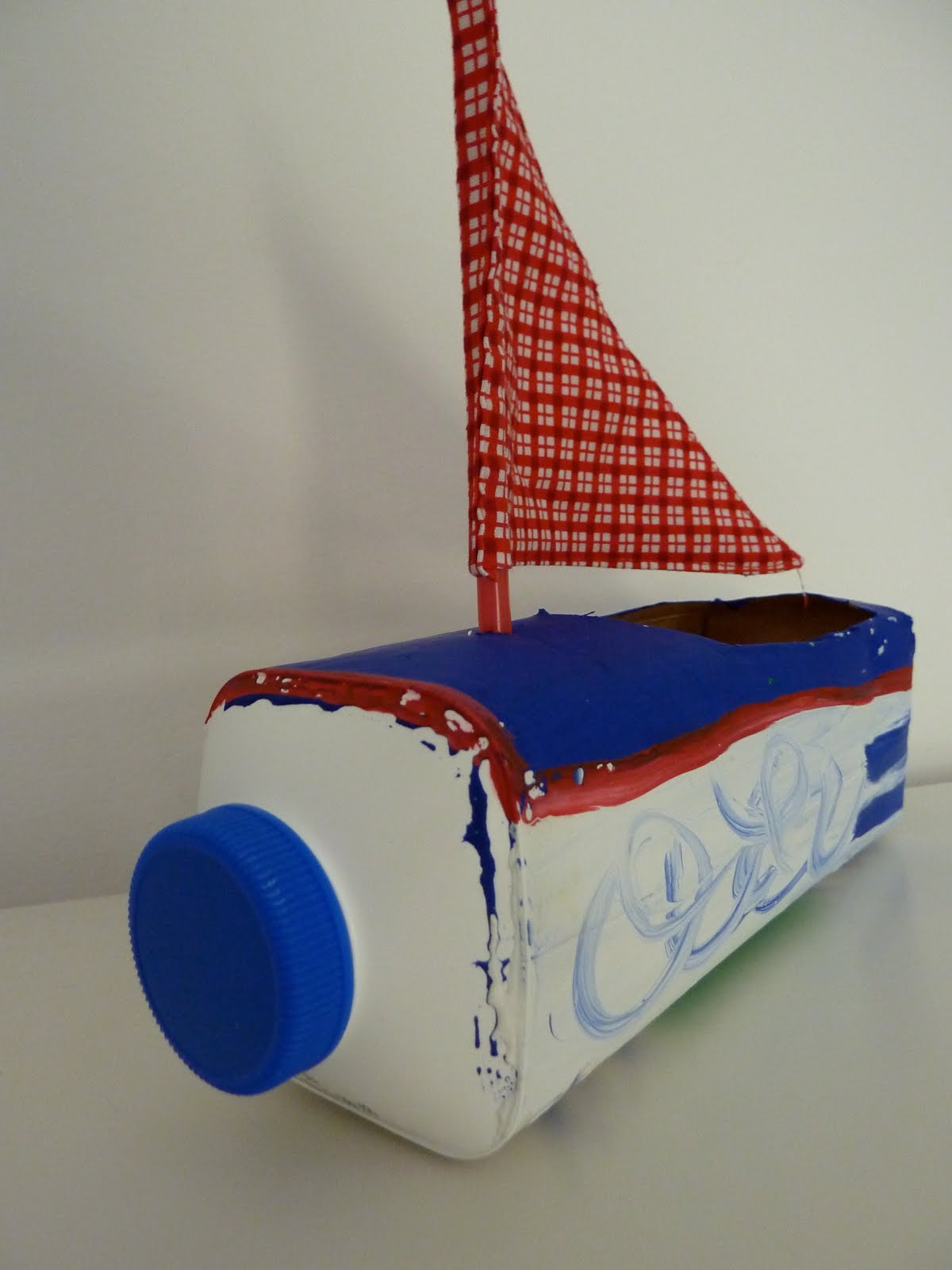 Seveda se nisem mogla upret čopičem in nastala je tudi moja ladjica, ki pa je (žal) romala v koš. Tetrapak je kljub pranju smrdel po skisanem. Bljak! Še en dokaz več, da je bolje uporabiti navaden tetrapak!
